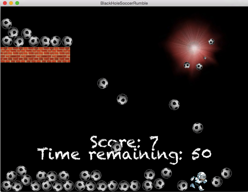 One Knight, lots of soccer balls and a black hole that eats objects that comes close enough. The Knight scores 1 point for each ball that he can get into the black hole. There is a time limit of 1 minute to get as many soccer balls as possible into the black hole. If the Knight gets too close to the black hole, he will be devoured and it is game over.